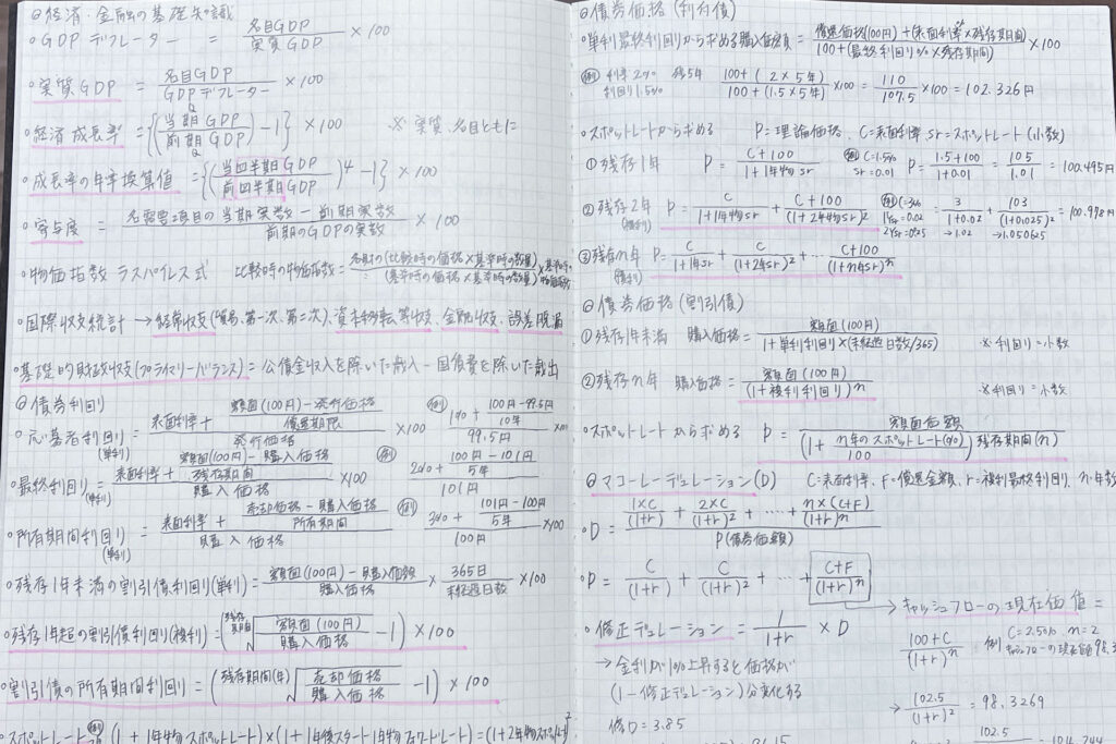 金融の場合、どこが重要というよりも、どこを捨てるか、を最初に考えると良いかと思います。過去問1周あたりで自分の得意不得意がある程度見えたら、苦手なところをバッサリ捨てましょう。私は最初に外国債券を捨てることはすぐに決めたのですが、国内債券は諦めきれず、数式を覚えようと努力しました。