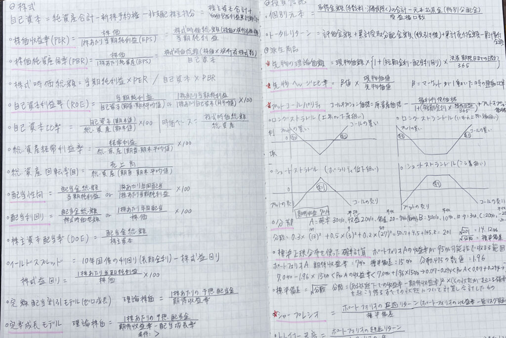 そこから割り切って、債券の中でも覚えやすいマコーレーデュレーションだけ繰り返し復習したり、先物の理論価格やポートフォリオのシャープレシオなど覚えやすいものに集中しましたが、この決断をもっと早くしておけば、債券以外の点に繋がったはず!捨てる勇気、大事。