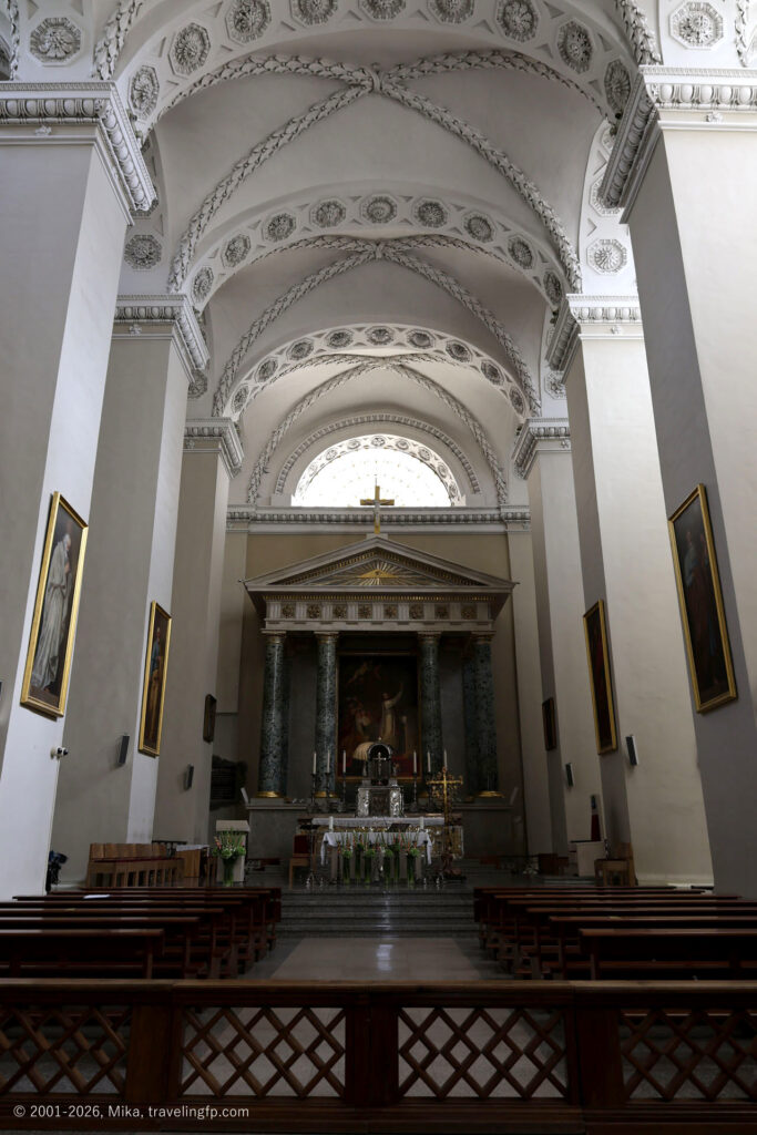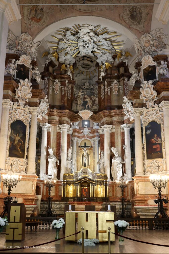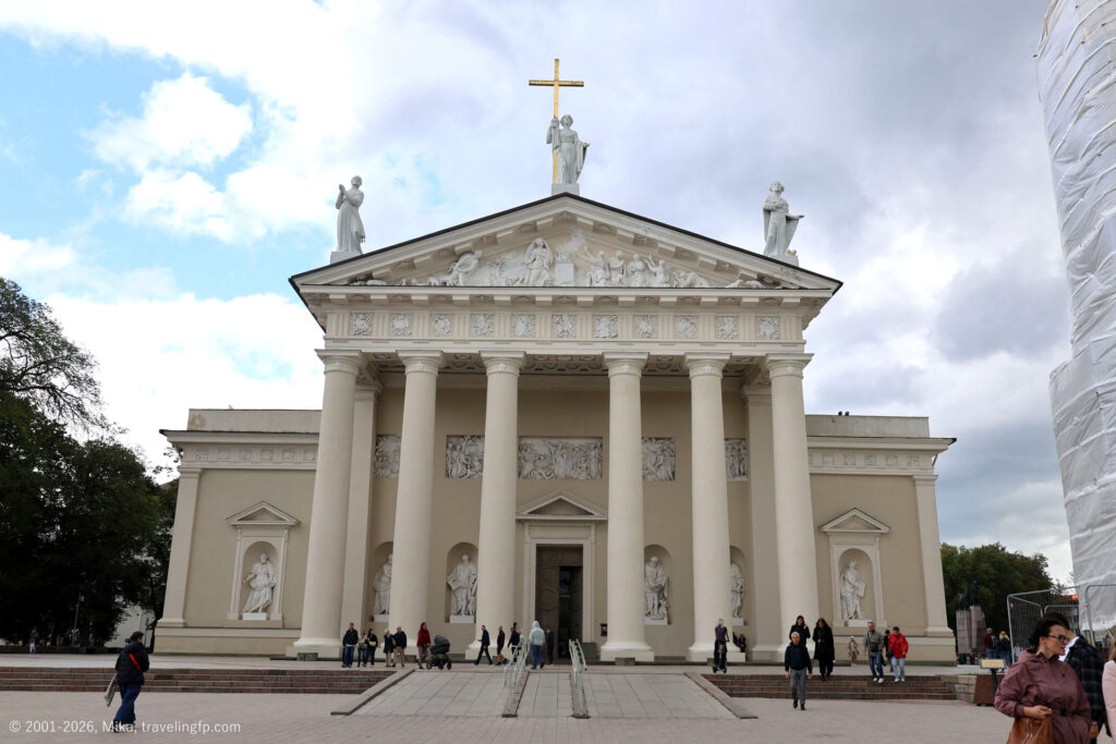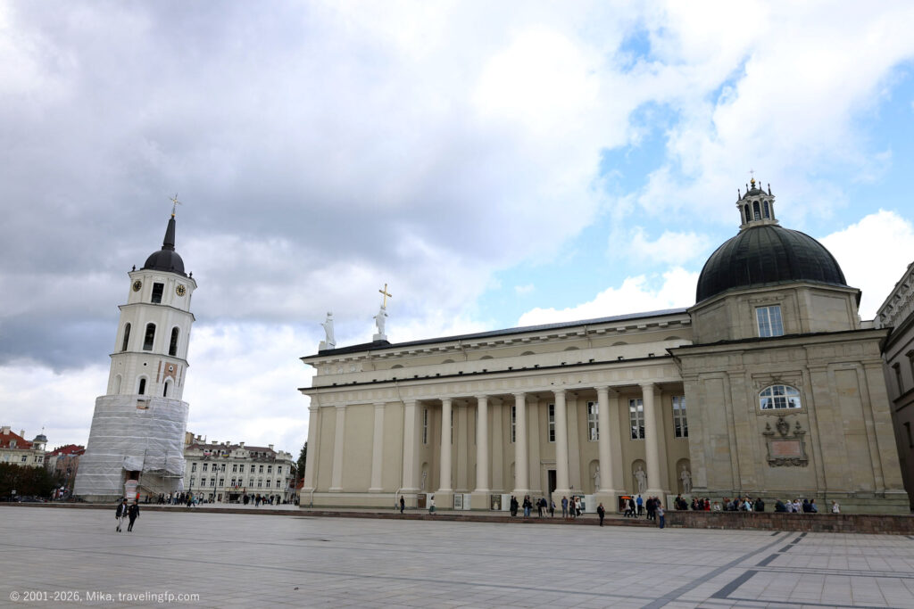 丘の下には国立博物館もありますが、建物を修復していてお休み中。城下に見えたリトアニア大公宮の隣にあるのが、ヴィリニュス大聖堂です。非常に大きくて立派な大聖堂。外観、内観ともにかなり装飾的です。