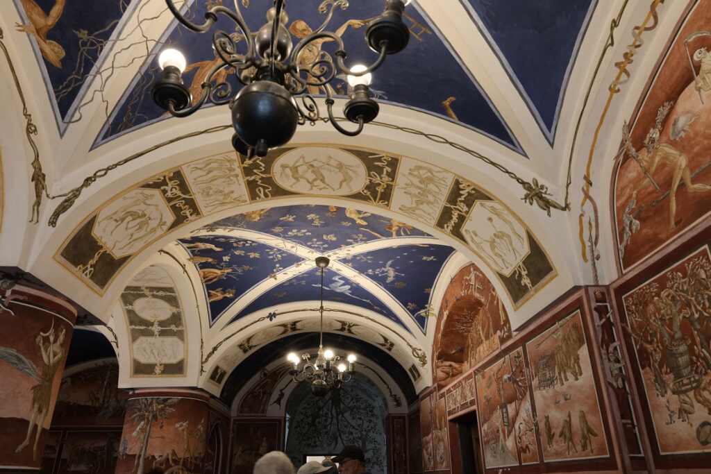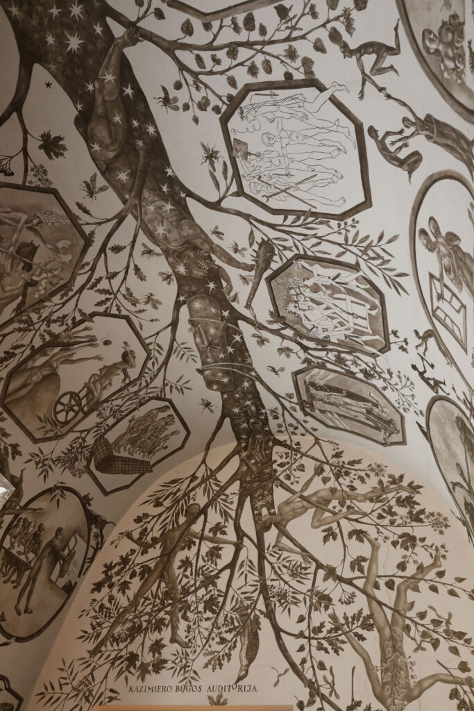 大学の入口にいた女性が、素晴らしいフレスコ画があるから見に行って!と言うので、メインの校舎とフレスコ画の建物へ。天井に描かれたフレスコ画は、古いものではなく、1970年代~1980年代にかけて、リトアニアの画家Petras Repšysによって描かれたもの。緻密で美しく、ずっと見てられます。