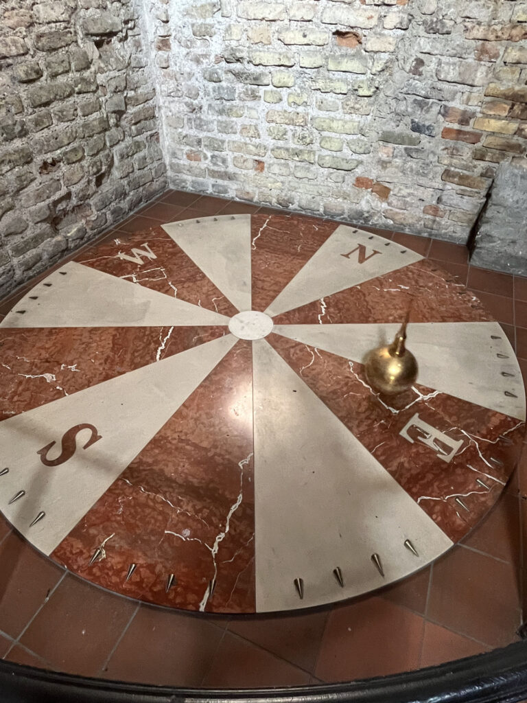 鐘楼にはフーコーの振り子(Foucault pendulum)という巨大な装置が。東西南北が書いてある振動面が、振り子に対して変化することが、地球の自転を証明するらしい。世界中まあまあ色んなところを旅したけど、これは初めて見た。そして鐘楼で流れる音楽の作曲家が、まさかの日本の方。私は全く知らなかったですが、細川俊夫さんて有名な方のようですね。2023年にレコーディングされたInvisible Angelsという楽曲を、毎時ごと聞くことができます。