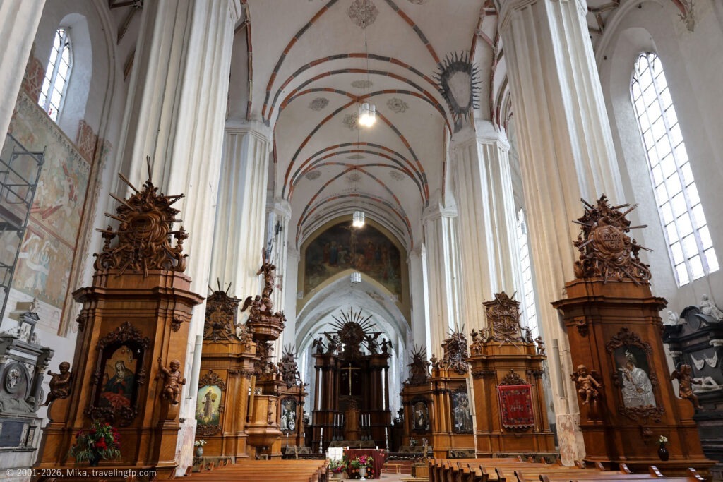 南に下って旧市街の中心あたりにあるのが、ヴィリニュス大学。1579年に設置された、中央&東ヨーロッパで最も古い大学の一つ。大学の入口すぐのところに聖ヨハネ教会と鐘楼があります。大学自体は無料で入れましたが、鐘楼に上るのは料金が必要でした。教会内部はザ・バロック!という装飾。全く知らなかったのですが、ヴィリニュスは18世紀に後期バロック様式の独自の流派が発展し、“ヴィリニュス・バロック”と呼ばれているそうです。このあとの教会も、こんなにもバロックを見たのはドイツ以来かも、というバロック・オンパレード状態でした。